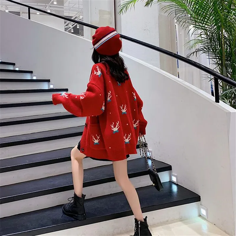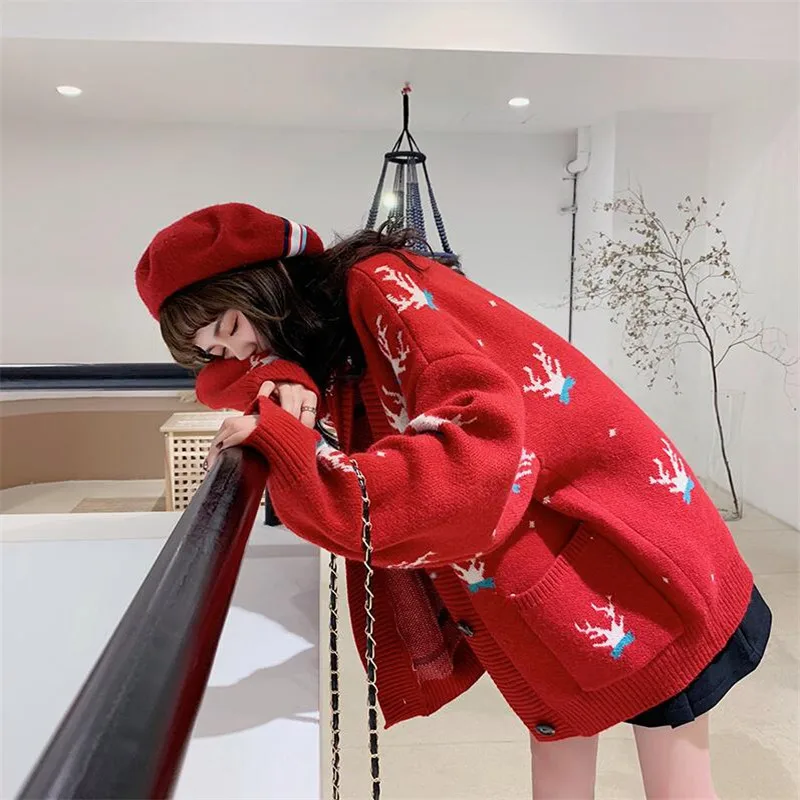 Women Christmas cardigan female v neck full sleeve sweater Korean version loose autumn and winter cardigans jacket thickening