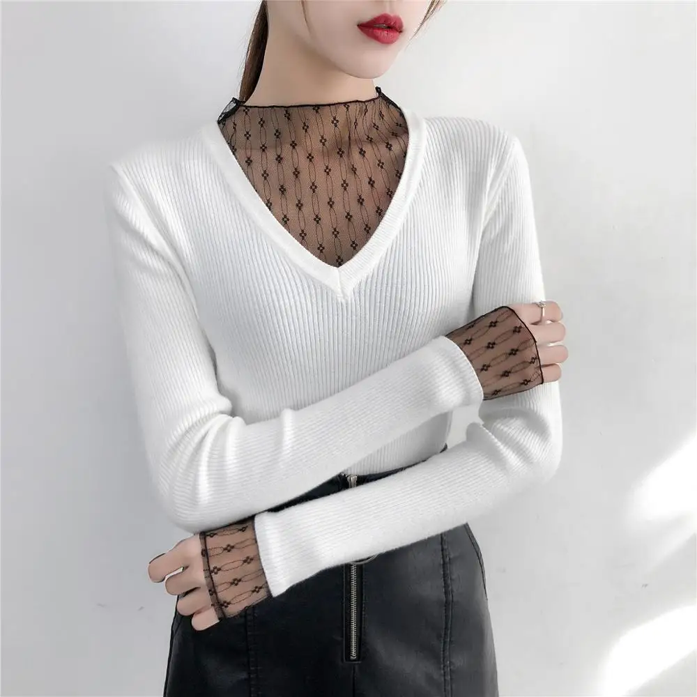 .image for Black White Mesh Patchwork Sexy Perspective Knitted Sweater For Women Basic Long Sleeve Pullover Sp