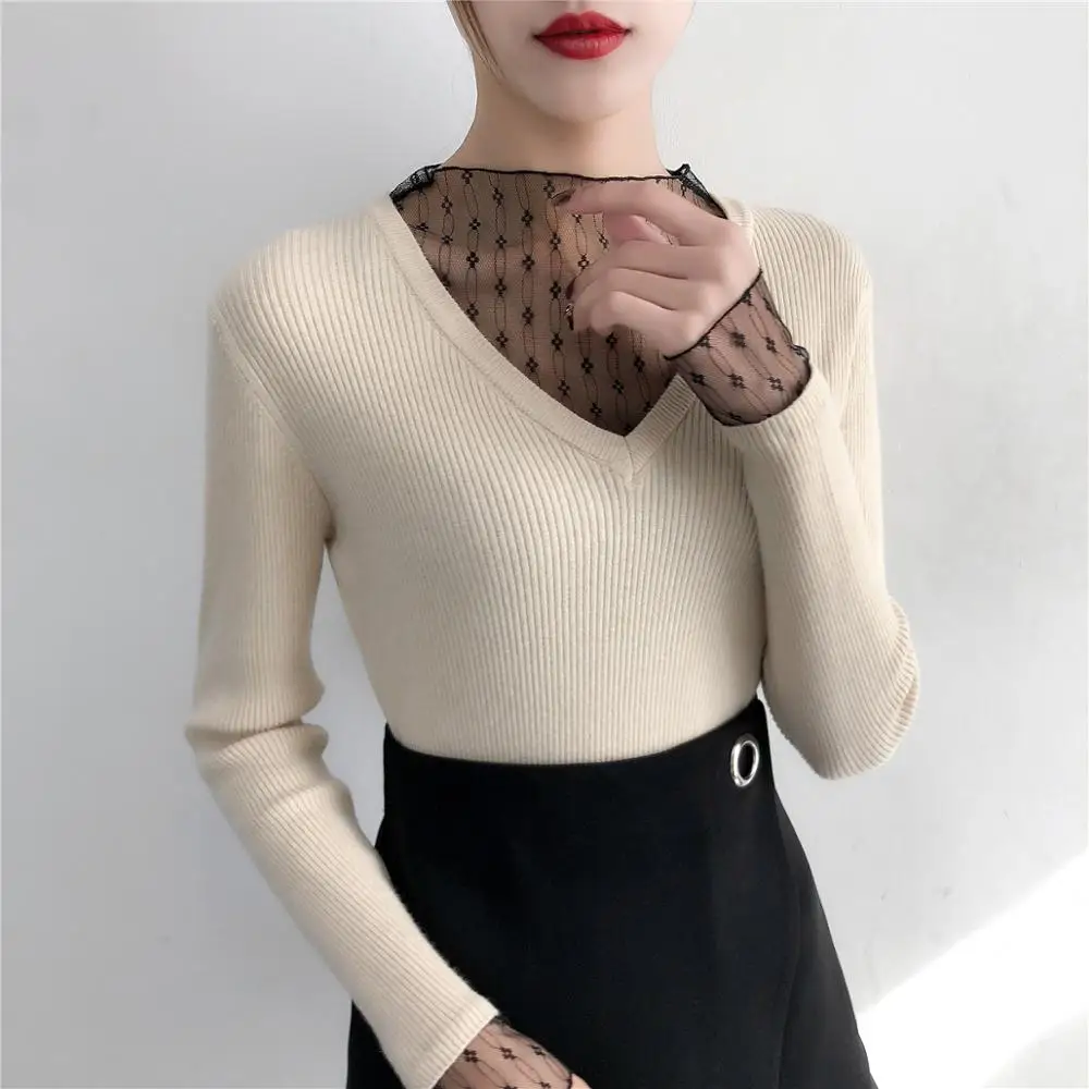 Elegant Lace Patchwork Turtleneck Women's Sweater Winter Warm Basic Knitted Jumper Female Korean Pullover Long Sleeve Spring Top